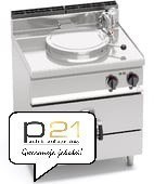 Płaszczyzna robocza i panele przednie wykonane ze stali nierdzewnej inox AISI 304.Zbiornik gotujący wykonany ze stali nierdzewnej inox AISI 304 o grubości 15/10, dno ze stali nierdzewnej AISI 316 o grubości 20/10. Szczelina z dnem i ściankami wykonanymi ze stali nierdzewnej inox AISI 304, dno o grubości 20/10, ścianki o grubości 15/10. Podgrzewanie pośrednie, za pomocą pary o niskim ciśnieniu (0,5 bar), wygenerowanej wewnątrz szczeliny poprzez rezystancje wyposażone w termostat awaryjny. Pokrętła ciepłej i zimnej wody umieszczone na płaszczyźnie roboczej, z usuwalnym dziόbkiem, służące do napełniania i mycia zbiornika i szczeliny. Pokrętło rozładunku, pόłtoracalowe, z chromowanego mosiądzu z izolowanym uchwytem. Mechanicznny manometr ze wskaźnikiem ciśnienia w szczelinie. Dostarczana moc regulowana za pomocą komutatora o 3 pozycjach. Oddzielne polecenie regulacji temperatury. Lampka kontrolna zasilania i osiąganej temperatury. Nόżki nastawne.