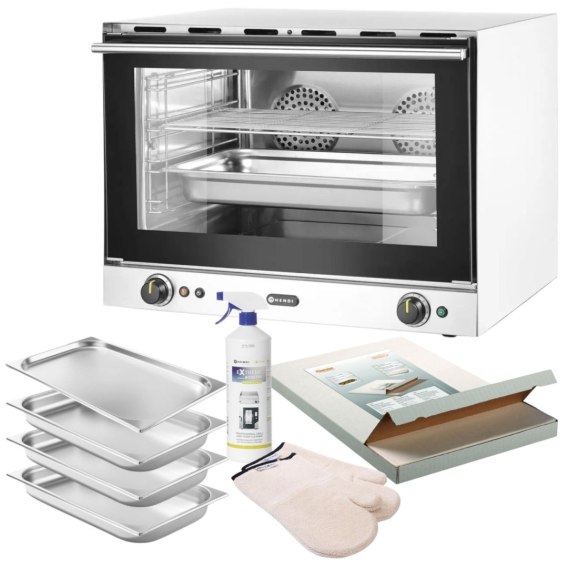 Piec konwekcyjny z nawilżaniem 3,5 kW 230V 4xGN 1/1 Zestaw XL z pojemnikami, rusztem, płynem do czyszczenia, rękawicami i papierem do pieczenia 699x608x580 mm