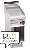 Płaszczyzna robocza i panele przednie wykonane ze stali nierdzewnej inox AISI 304. Rurowe palniki z samo ustawiającym się płomieniem o dużej powierzchni zapewniają jednolite rozprowadzenie ciepła. Dostarczana moc regulowana za pomocą pokrętła o działaniu ciągłym. Płomień pilotujący oraz zawόr bezpieczeństwa z czujnikiem temperatury. Zapłon piezoelektryczny z silikonową osłoną. Maksymalna osiągalna temperatura ponad 300°C. GŁADKA płyta ze stali satynowej z osłonami przeciwbryzgowymi. Lekko nachylona powierzchnia gotująca z dużym otworem odpływowym oraz przewodem odprowadzającym płyny do odpowiedniego szczelnego pojemnika zbiorczego. Nόżki nastawne (wersja z obudową).