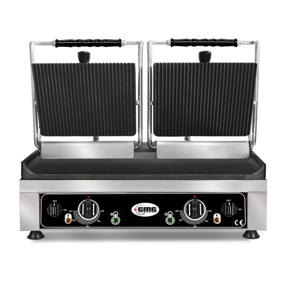 GMG KG 5530 DG to podwójny grill kontaktowy o wysokiej mocy 3500W, zaprojektowany dla intensywnie pracujących kuchni gastronomicznych. Dzięki połączeniu gładkiej dolnej płyty z ryflowaną płytą górną urządzenie zapewnia maksymalną wszechstronność i doskonałe rezultaty w przygotowaniu mięs, burgerów, panini, warzyw oraz pieczywa. Podwójna konstrukcja pozwala jednocześnie obsługiwać więcej porcji, co znacząco zwiększa wydajność pracy.