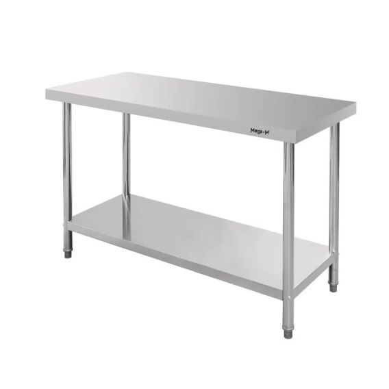 Centralny dwupoziomowy stół gastronomiczny 120x60x85 cm został wykonany ze stali nierdzewnej o grubości 0,6 mm, która jest odporna na wszelkiego rodzaju uszkodzenia mechaniczne, zarysowania i korozję oraz biologicznie obojętna (nie wchodzi w reakcję z żywnością). Stół gastronomiczny STANDARD został wyposażony w dolną półkę, na której możliwe jest przechowywanie naczyń i akcesoriów potrzebnych w kuchni oraz regulowane nóżki, za pomocą których można dopasować stół do każdego nawet nierównego podłoża. Dzięki swojej gładkiej powierzchni mebel jest łatwy do utrzymania w czystości.