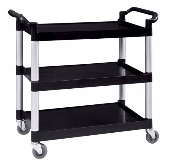 Czarny wózek kelnerski o wymiarach 1070 × 500 × 970 mm to praktyczne i estetyczne rozwiązanie do codziennego użytku w gastronomii. Wyposażony w 3 wytrzymałe półki z tworzywa sztucznego oraz solidne metalowe słupki nośne, łączy nowoczesny wygląd z wysoką odpornością na obciążenia. Idealnie sprawdzi się w restauracjach, barach, punktach typu fast-food, hotelach, szpitalach czy firmach cateringowych.